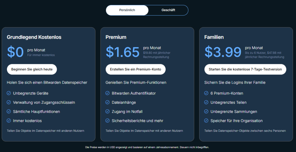 Preise sind laut Bitwarden in USD angegeben, basieren auf jährlicher Abrechnung und enthalten keine Steuern.