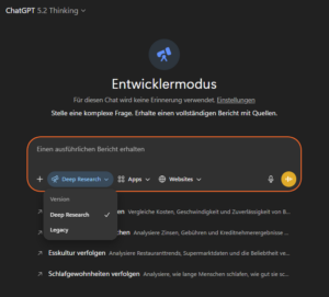 In ChatGPT kannst du je nach Tarif außerdem zwischen Varianten wählen, etwa Instant für Tempo und Thinking für mehr Tiefe. Für Deep Research ist Thinking oft sinnvoll, wenn du komplexe Abwägungen brauchst.