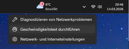 Mit dem März 2026 Update für Windows 11 (KB5079473) kommt ein neuer Speedtest Eintrag in der Taskleiste. Du kannst ihn aus den Quick Settings öffnen oder per Rechtsklick auf das Netzwerk Symbol in der Taskleiste starten. Der Test öffnet sich im Standardbrowser und misst die Verbindung über Ethernet, WLAN oder Mobilfunk.