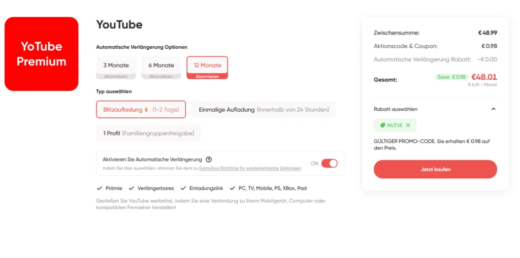 | GamsGo YouTube Premium Jahresabo | ab 48.01 € / Einmalig mit Code NVZVE |